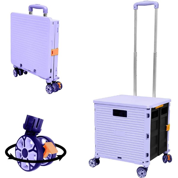 Quick Utility Cart Folding Portable Rolling Crate Handcart with Durable Heavy Duty Plastic Telescoping Handle Collapsible 4 Rotate Wheels for Travel Shopping Moving Luggage Office Use (Purple)