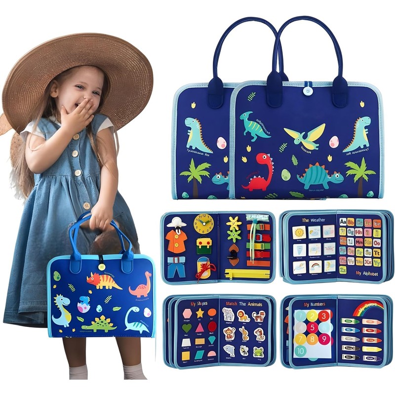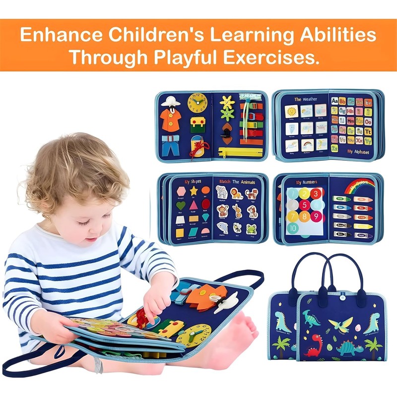 - this Busy Book Ideal for toddlers aged 1-3, our busy book is perfect for outdoor play. Designed to fit in bags it features handles for easy carrying by toddlers. This educational toy is great for keeping kids engaged and quiet during journeys or when they dislike being confined in a car seat, preventing boredom or crying.