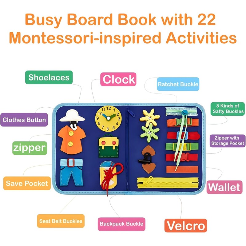 - Montessori busy boards are ideal for early learning, promoting color recognition and problem-solving skills. With zippers, shoelaces, buckles, and buttons, preschoolers practice essential life skills, while parents can use the board to teach counting, spelling letters, and enjoy quality family time.
