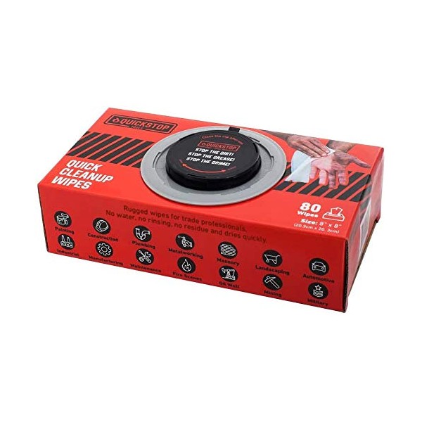 Quickstop Tools Wipes - Quick Cleanup Wipes, Heavy Duty Multi-Surface Cleaning Wipes, Industrial Strength Hand & Tool Wet Wipes for Grease, Oil, Tar, & Paint, Safe on Skin, 8'' x 8'' (80 Pack)
