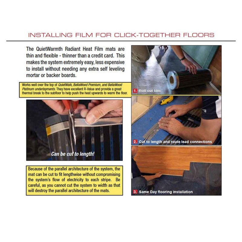 - easy installation - 3 simple step process (1. install underlayment, 2. roll out electric radiant heat film & 3. install final floor covering)