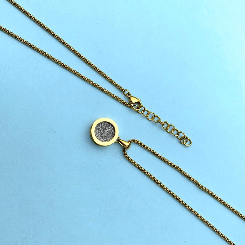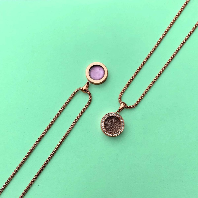 - The mini coin pendant holder necklace set is available in 4 colours: silver, rose gold, gold and black. It is also available with or without sparkling zirconia stones in the edge of the locket and in a matte or shiny steel finish