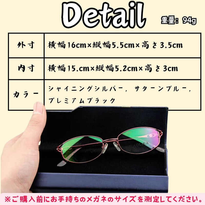 • Size: External Dimensions (W x H x D): 6.3 x 2.2 x 1.4 inches (16 x 5.5 x 3.5 cm); Interior Dimensions: Width x Height x Height x 1.2 inches (15.5 x 5.2 x 3 cm); Weight: 3.2 oz (94 g). Please measure the size of your glasses before purchasing
