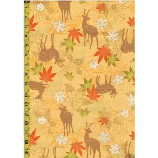 Imported from Quilt Gate of Japan, this fabric features woodland deer and colorful maple leaves with gold metallic accents.