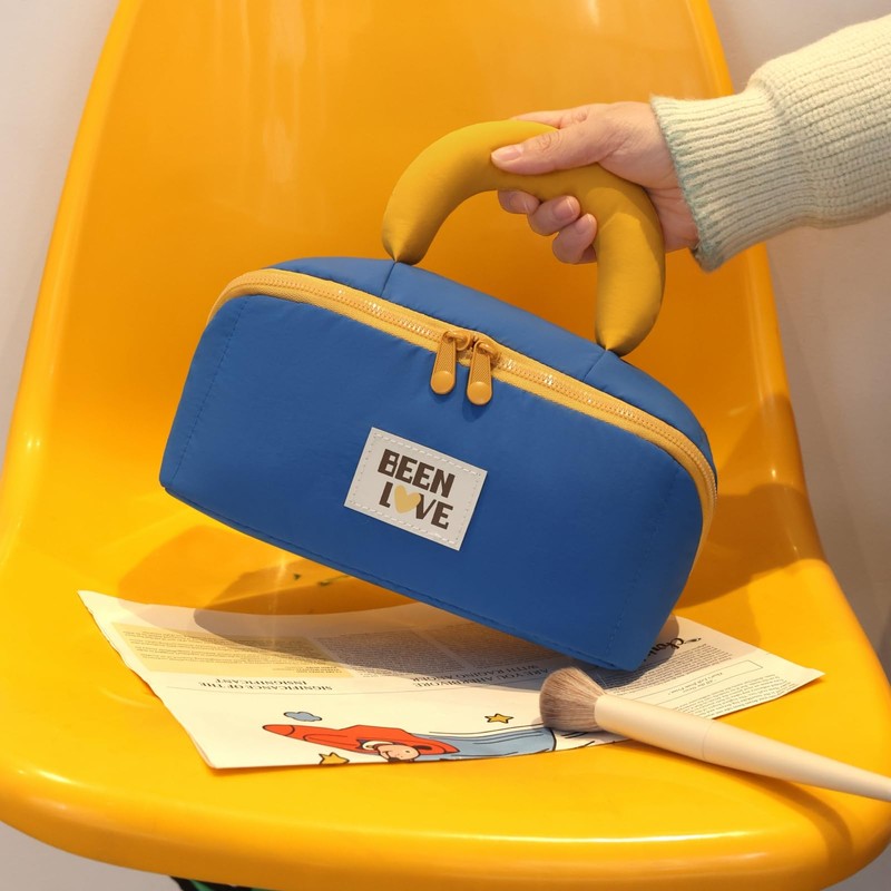 Quilted Makeup Bag, Large Capacity Travel Organizer, Waterproof Nylon, Wide Opening with Handle, 20.5 x 9 x 14.5 cm (Blue)