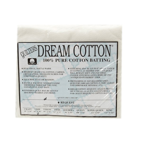 Quilters Dream Cotton starts with the finest USA cotton and is carded crosslapped and specially needlepunched. 100% natural our batting proudly bears Cotton Incorporateds seal. Our special process prevents shifting and lumping. It has a very high thermal value (R=3.8) warm in the winter yet wicks moisture away from the body to keep you cool in the summer. This package contains one 46'' x 60'' crib size batting.