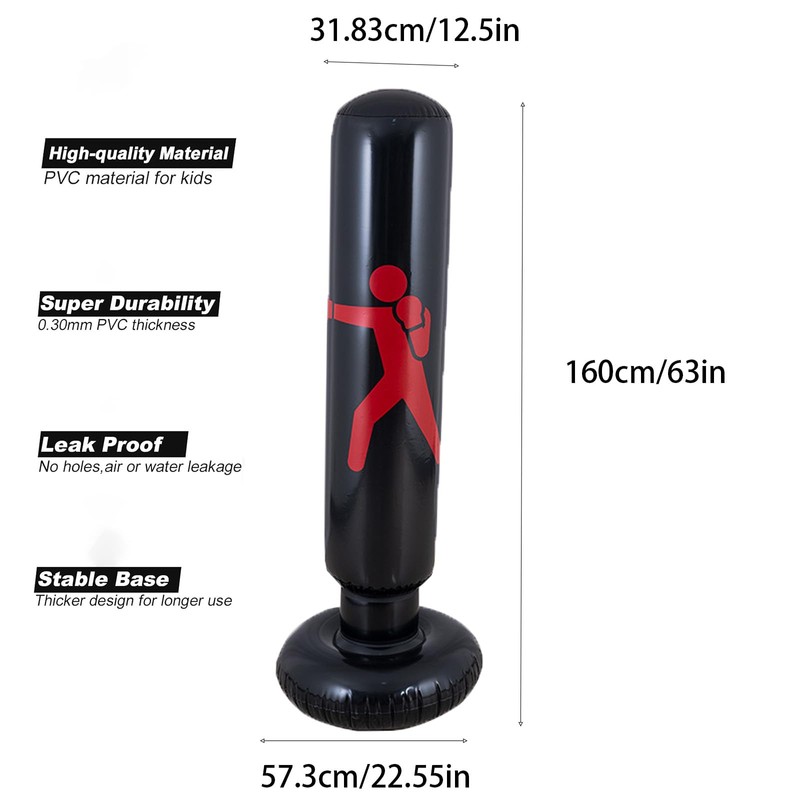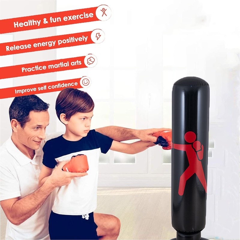 - FUN & HEALTH This punching bag set is a great way for kids to have fun, stay active and exercise. With the inflatable punch bag, children can release stress and boredom when they are in a bad mood or have nothing else to do, but also arouse their interest in boxing and karate and improve their physique. Our boxing bag is a perfect choice for an ideal gift