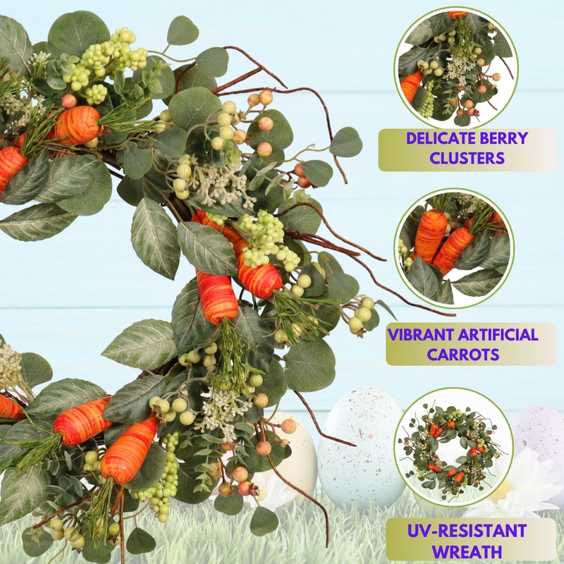 - Whimsical, Lifelike Artificial Spring Design 22IN: Crafted from durable artificial greenery, this cheerful artificial Carrot Eucalyptus wreath 22IN features realistic orange carrots with white accents, lush Eucalyptus leaves, delicate baby’s breath, green berries, and twigs in orange green white tones—delivering a fresh, full look that stays beautiful year after year as a year-round Carrot wreath or festive spring Easter wreath with Carrots, without fading or wear