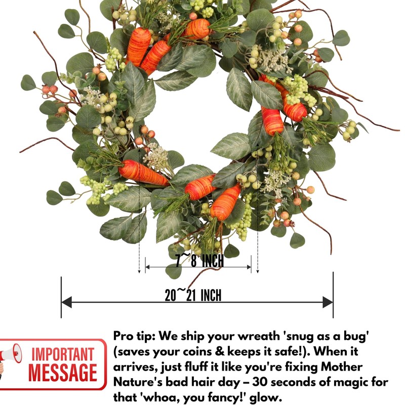 - Designed for Nature Lovers and Spring/Easter Decor Fans 22IN: Tailored for homeowners, spring enthusiasts, or anyone who loves natural style, this unique Carrot Eucalyptus combination wreath 22IN is perfect for those seeking an easy-care, trendy stylish nature lovers wreath for wall decoration or Easter accent, adding a bright, festive feel to your living spaces with its beautiful farmhouse Easter carrot wreath charm in this versatile 22IN size