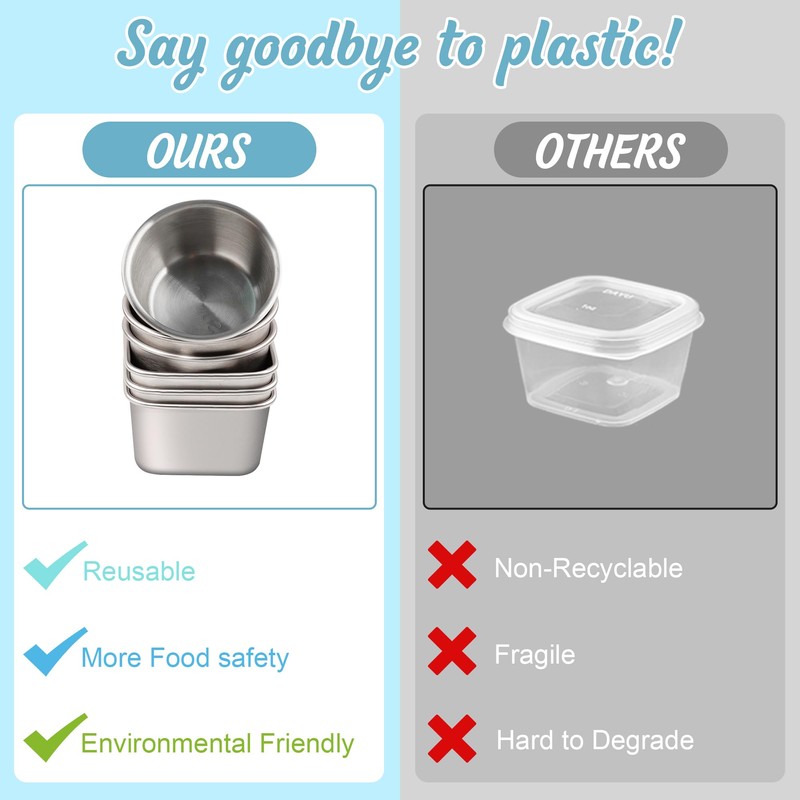- 【SAFE AND RELIABLE MATERIAL】: The small container with lid is made of quality 304 stainless steel and food-grade safe silicone, which makes our sauce cup non-toxic, dishwasher safe, freezer safe and durable enough for long-termism lifestyle. Our salad container for lunch can completely replace disposable containers, reduce the use of plastic and achieve environmental protection