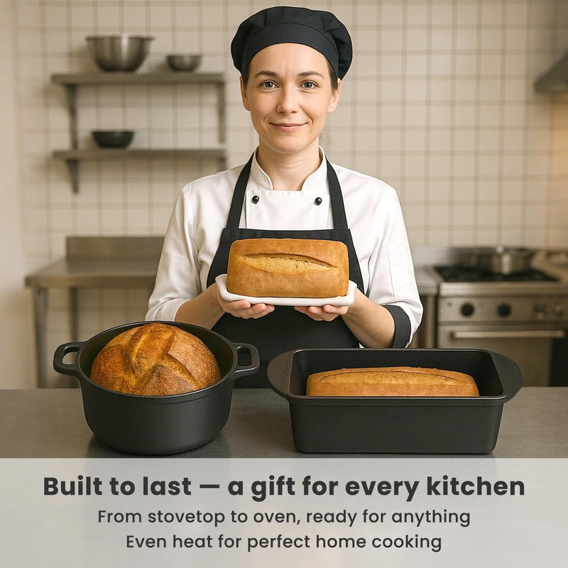• Easy to Clean and Maintain Cast Iron Cookware — With proper seasoning, your cast iron Dutch oven and bread pan develop a naturally non-stick surface that’s easy to clean. Avoid soap, dry thoroughly after use, and occasionally re-season to keep your cast iron pots and pans rust-free and long-lasting.