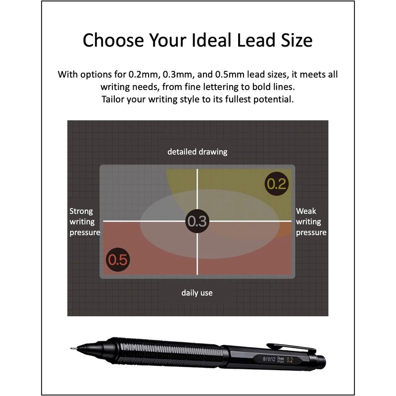 - Choose Your Ideal Lead Size - With options for 0.2mm, 0.3mm, and 0.5mm lead sizes, it meets all writing needs, from fine lettering to bold lines. Tailor your writing style to its fullest potential.