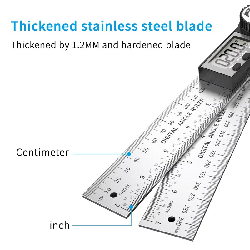 - 【2 in 1 Digital Protractor】Digital stainless steel ruler and angle finder combo makes precise measurements. The hinge mechanism on the angle rule allows complete 360-degree measurement of internal and reverse angles; The protractor combines standard and metric scale scales. Relative and absolute angle measurement.
