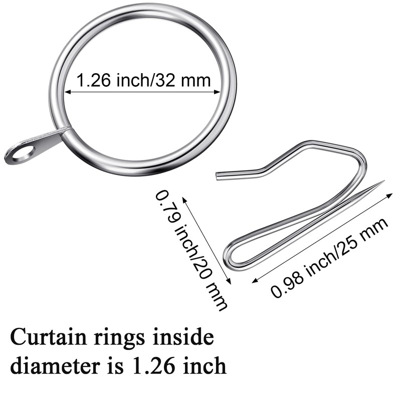 - Size Information: the metal drapery curtain ring size is approx. 1.26 inch in diameter, the metal curtain drapery pin hook size is approx. 1 x 0.8 inch, proper size fits for most curtain, please make sure the size before purchase; Fits up to 1 inch or smaller diameter curtain rod