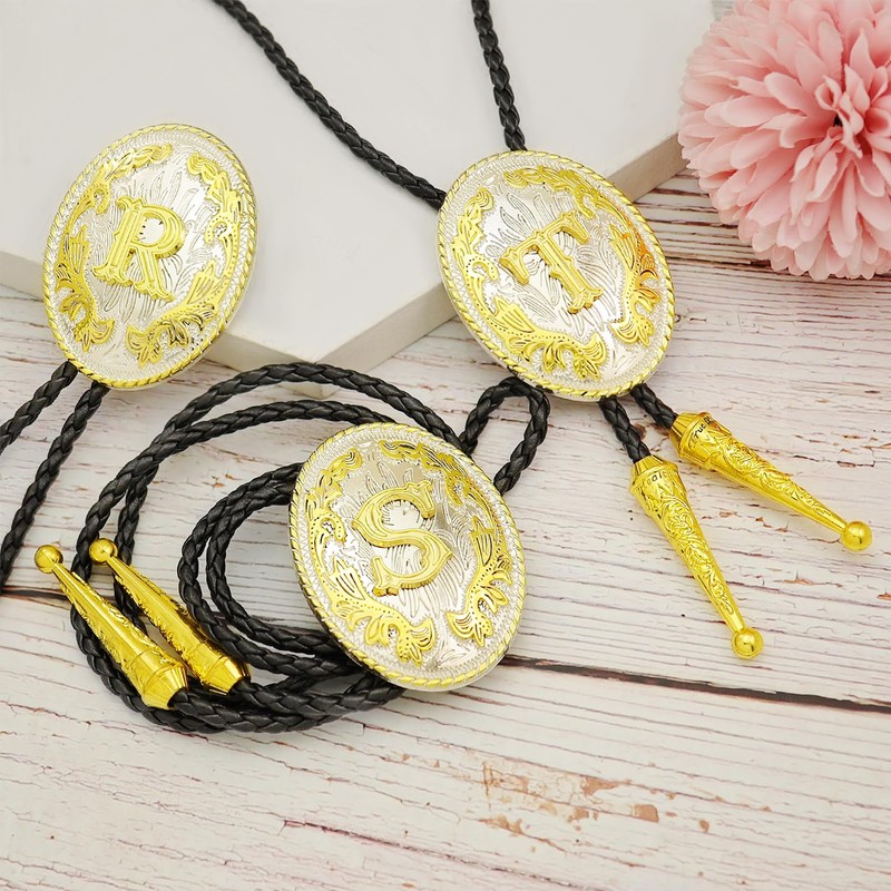 QuneusHot 2 Piece Western Belt Buckle Bolo Tie Set Initial Letter ABC to XYZ Cowboy Costume Gold Accessories for Men Women, Gold T, Large