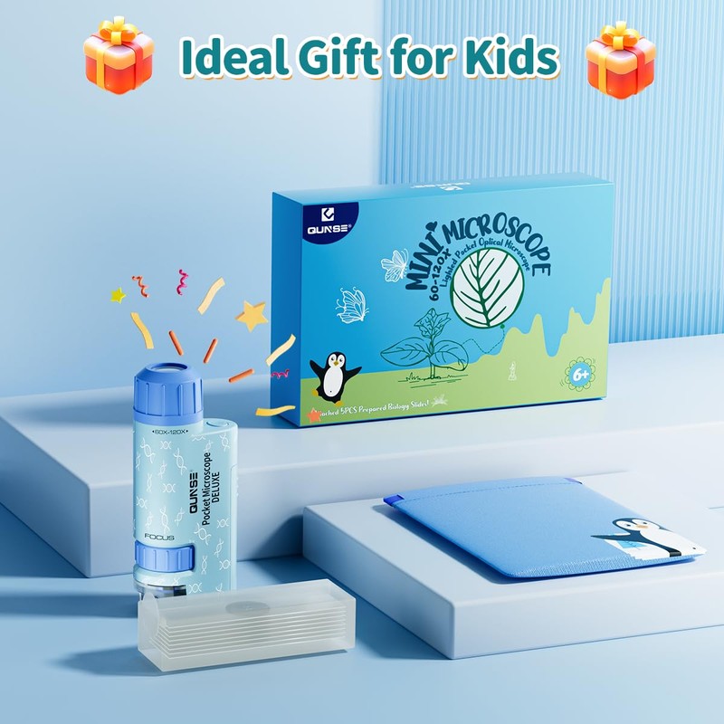 QUNSE Mini Children's Pocket Microscope for Children 60 x 120 x 5 Cuts with Microscope Preparations (Blue)