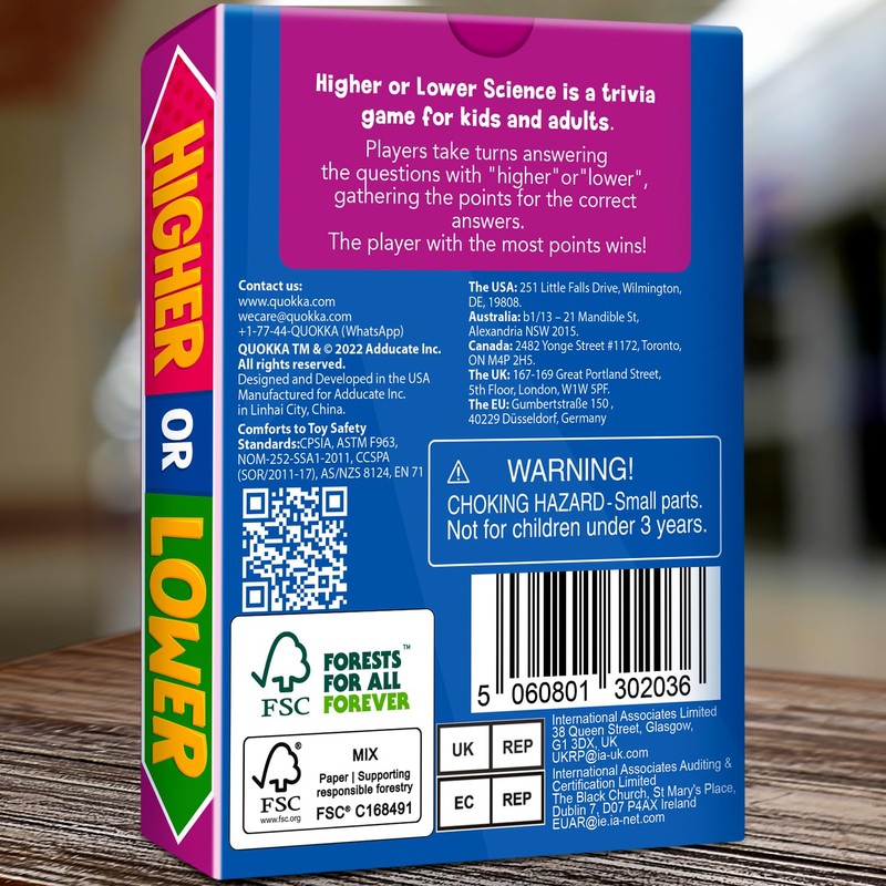 Discover the fun of learning with QUOKKA The Social Store's "Higher or Lower? - Science Edition"! This engaging quiz and trivia card game is perfect for both kids and family game nights. Players guess whether scientific facts and statistics are higher or lower than what's on the cards, testing their knowledge and learning new and intriguing science facts along the way. Easy to play and educational, this game sparks curiosity and offers hours of entertainment and learning. Whether at home, in the classroom, or on the go, "Higher or Lower?" is sure to bring laughter and learning to the table. Suitable for science enthusiasts and trivia buffs of all ages!