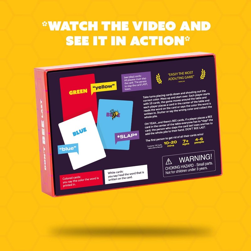 - You better be paying attention because if a person places a BEE card in the center of the table, everyone has to slap it. The person who slaps the BEE card last gets “stung” and has to add the whole pile to their hand.