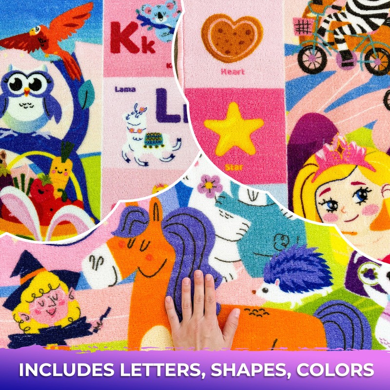 - EDUCATIONAL AND FUN: bring the alphabet to life in your child's with our alphabet rugs for kids room; The rug consists of 26 alphabets, animals, shapes, colors, and more.