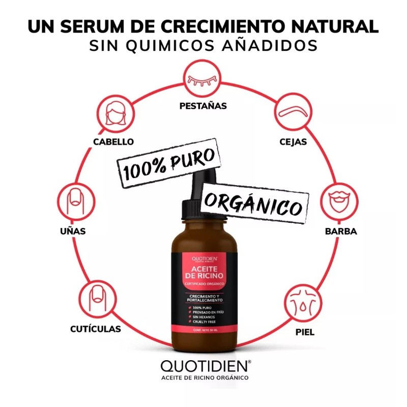 El Aceite de Ricino Quotidien es un suero 100% puro, certificado orgánico por OTCO, sin hexanos, prensado en frío y sin el uso de productos químicos agresivos o disolventes. Su función principal es estimular el crecimiento y detener la caída de cabello, alargar y engrosar pestañas y cejas, restaurar el cabello dañado, proteger y fortalecer uñas y cutículas.
