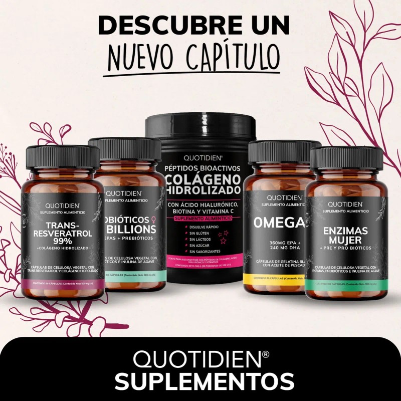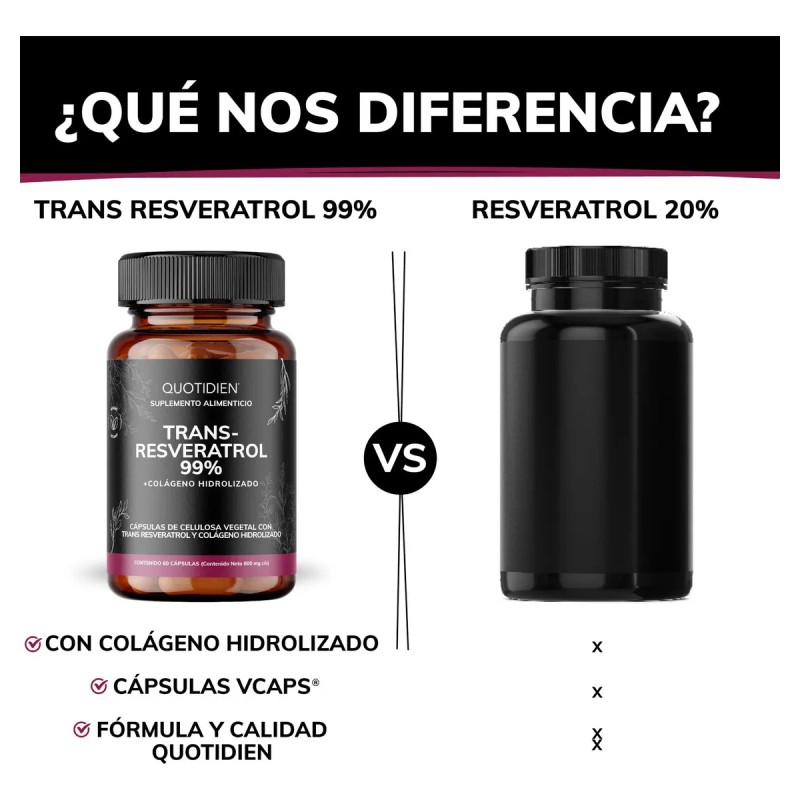Aquí están los beneficios clave para el producto "Quotidien | Trans Resveratrol 99% - 100% Puro Con Colágeno Hidrolizado Polvo Y Calcio - Vitaminas Mujer - 60 Cápsulas Veganas Vcaps":