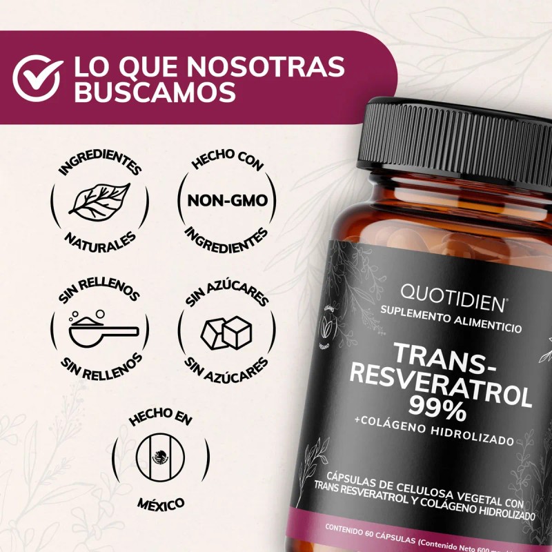 - Resveratrol con los beneficios de apoyo del colágeno hidrolizado. Este suplemento de alta calidad está diseñado para quienes buscan una opción eficaz y natural para su rutina diaria. Trans