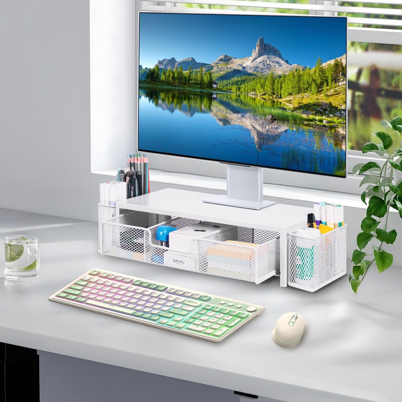 - 【Space Saving】This monitor stand has a built-in drawer and two hanging pen holders – perfect for stashing your office supplies and keeping them within reach. Tidy up your work area and feel calmer at your desk
