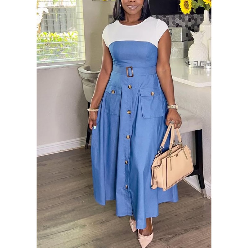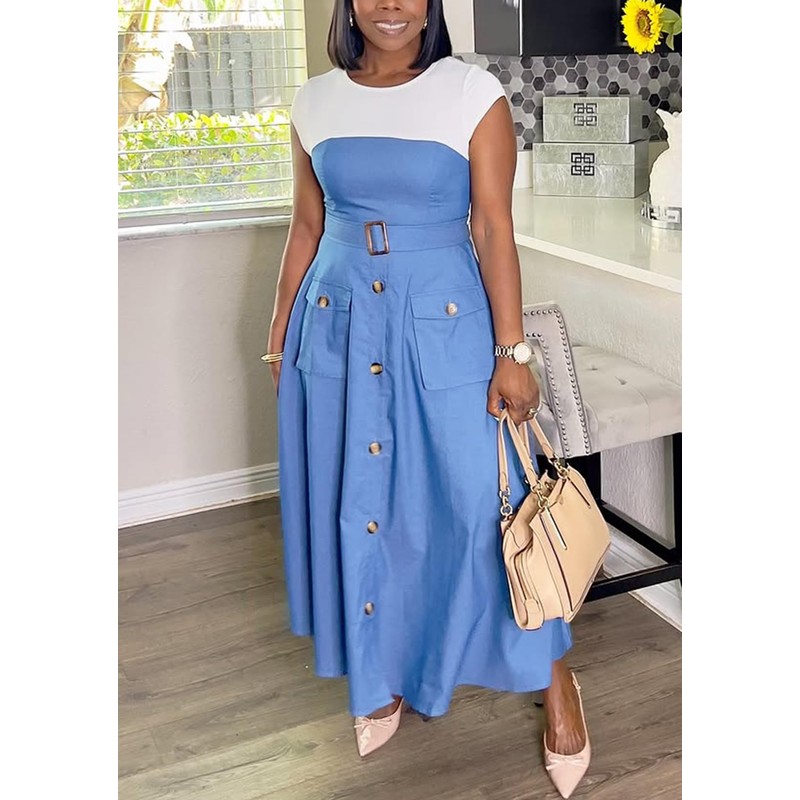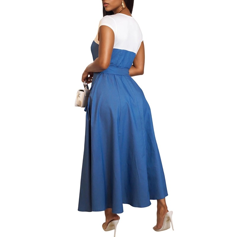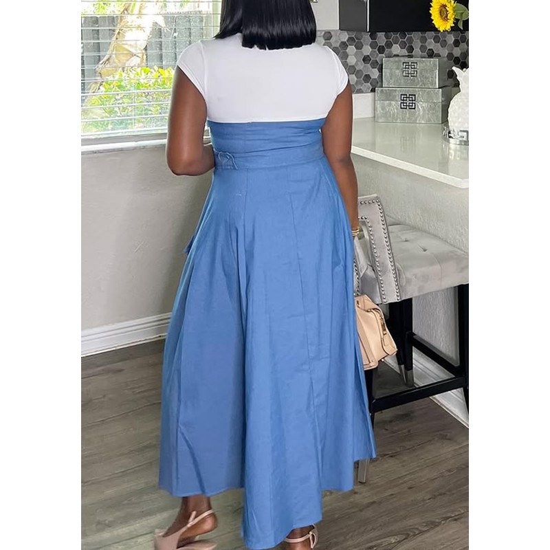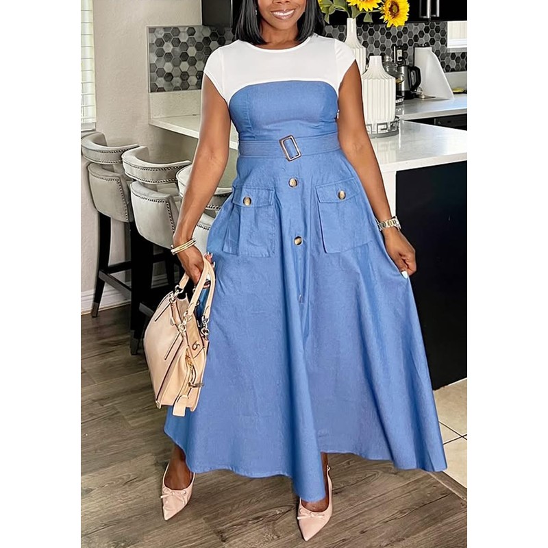 Quzzion Women's Patchwork Denim Dress A Line Maxi Swing Dresses Cap Sleeve Belted Cargo Jean Dresses with Pockets Blue