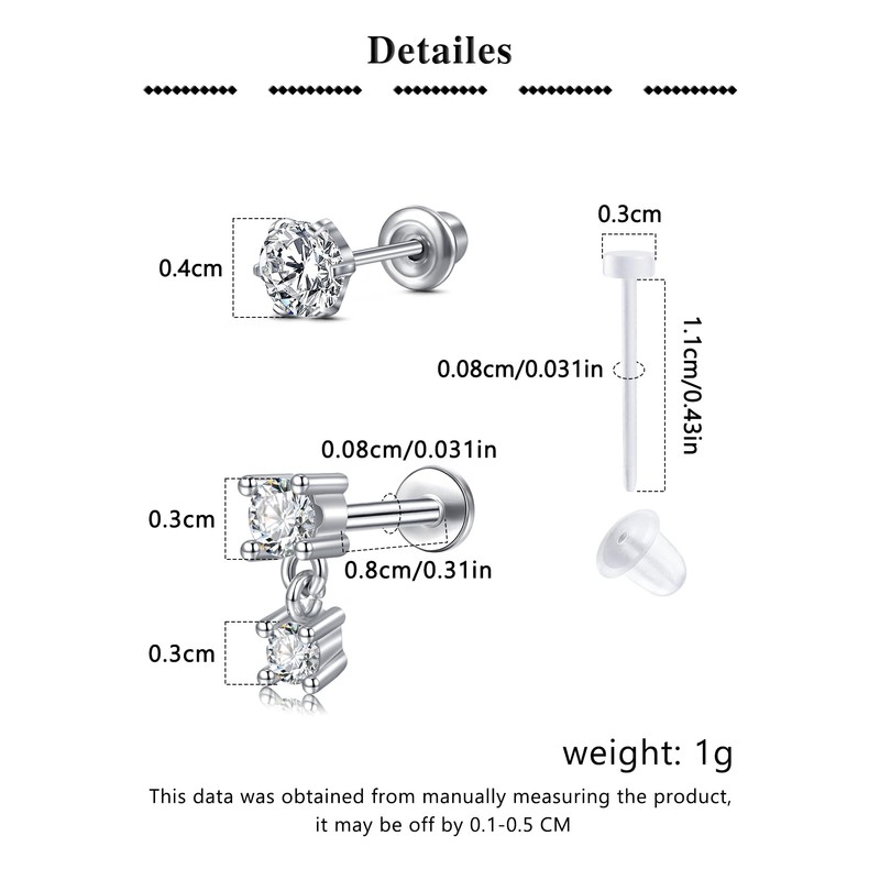 - Measurements - earrings studs 20g (usually used for earlobe ), ear studs length : 10-11mm, Built in small earring studs top size: 3mm; Flat back earring studs 20 gauge * 5/16"(8mm), silver earring studs top size: 3mm;