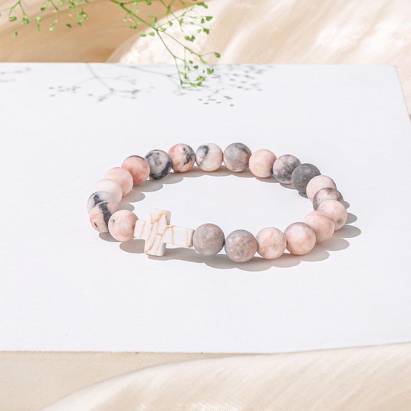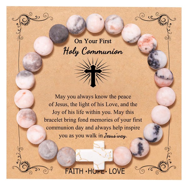QWNHONEY Christian Gifts On Your Communition Cross Bracelet for Women Faith Religious Easter Catholic Christian Jewelry Meaningful Communion Baptism Natural Beads Bracelets Pink Zebra Jasper