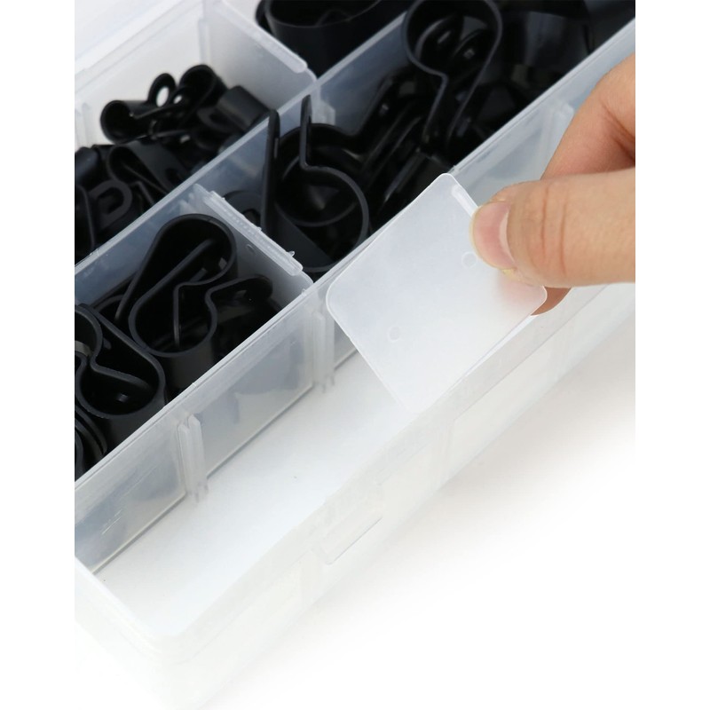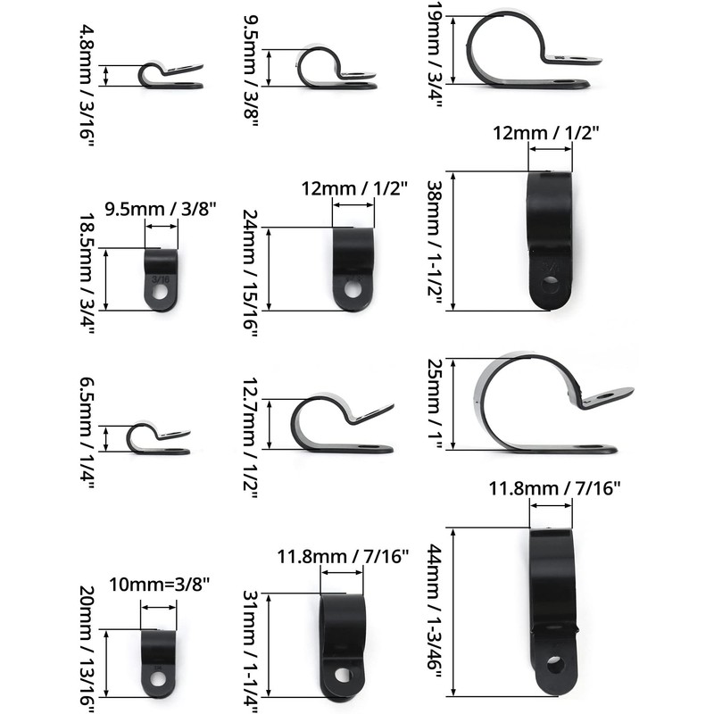 - 6 SIZES AVAILABLE: 50pcs x 5mm (3/16") P Clips; 50pcs x 6mm (1/4") P Clips; 50pcs x 9mm (3/8") P Clips; 20pcs x 12mm (1/2") P Clips; 20pcs x 19mm (3/4") P Clips; 10pcs x 28mm (1 1/16") P Clips