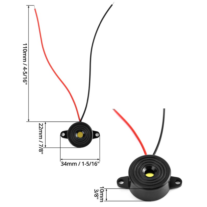 - Cable length: 100 mm; Diameter: 23 mm; 12 volt buzzer works with DC 3-24 V, sound pressure level: 87 dB.