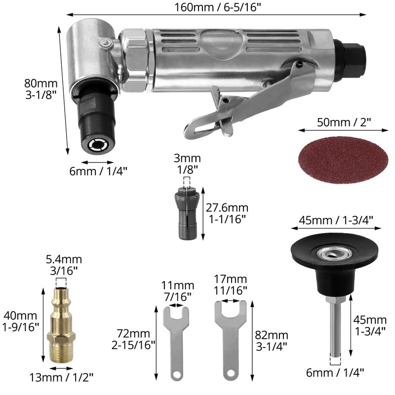 • Ready for air supply: air inlet size 1/4", air consumption 6 CFM, operating pressure 6 bar, idle speed 12000 rpm, compatible with any air compressor for efficient and powerful performance.