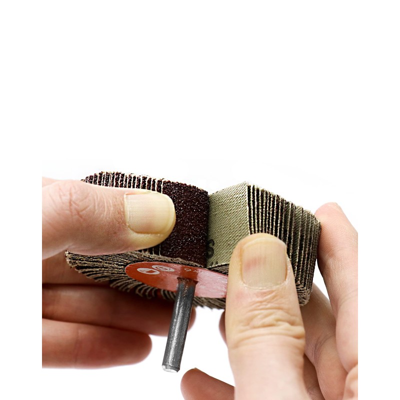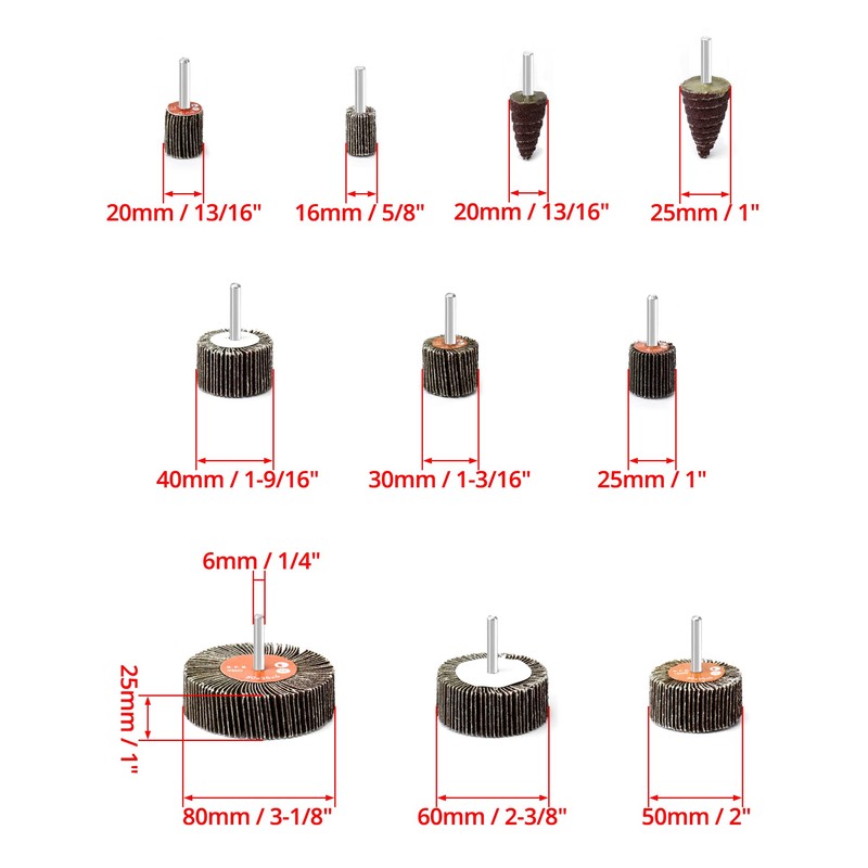 - Pack of 20 lamella sanders: 10 types, handle: diameter 6 mm, grit: 80 mesh. Diameter 15 mm, 20 mm, 25 mm, 30 mm, 40 mm, 50 mm, 60 mm, 80 mm.