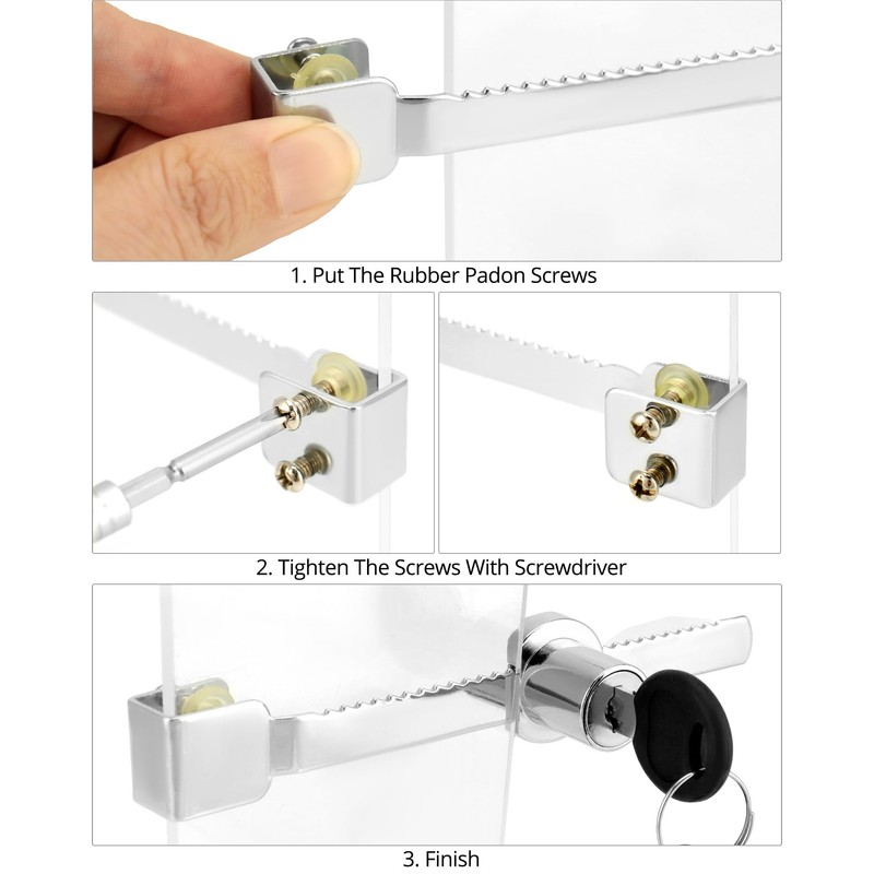 • Easy Installation: Our display case lock can be easily installed using a screwdriver attachment, making it convenient and hassle-free. Each package contains 12 sliding glass door locks and 24 keys that are alike, allowing for multiple locks to be used with the same key.
