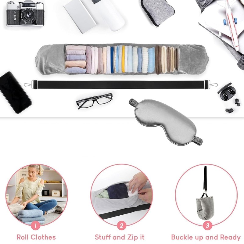 Benefit: Eye mask Lightweight and breathable,Blocks out bright sun light. Our stuffable neck pillow for travel ensures a comfortable sleep during your traveling.With its self-filling feature, you can save luggage space by stuffing your clothes into this pillows.