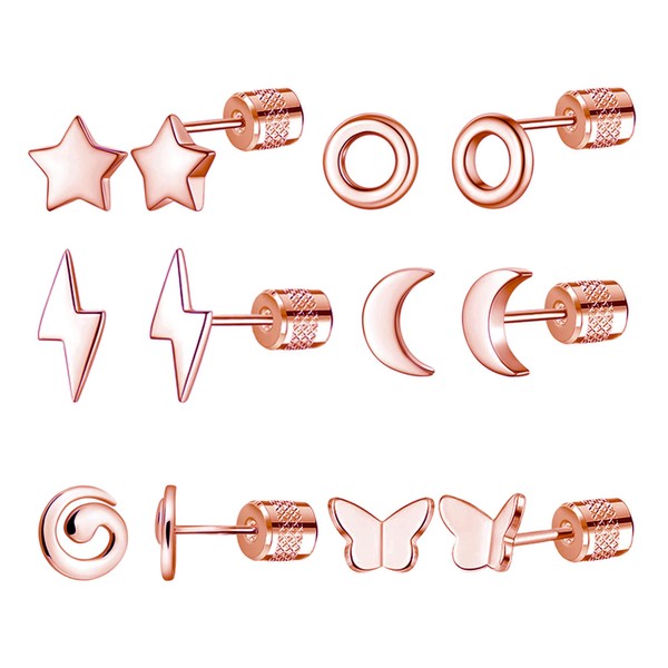 QXXPVV 6Pairs 20G Threadless Flat Back Stud Earrings, Stainless Steel Hypoallergenic Simple Geometric Small Stud Earring Set Cartilage Tragus Earrings for Women Men(6Pairs studs rose gold)