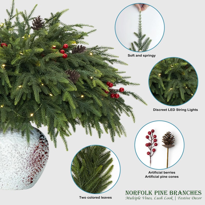 - 【Stunning Christmas Decorations with Realistic Texture】Designed using eco-friendly dual-color technology, these Norfolk Pine stems replicate natural pine branches flawlessly—no paint.Enjoy a fresh, natural holiday atmosphere with lifelike details that blend seamlessly into any festive setting.