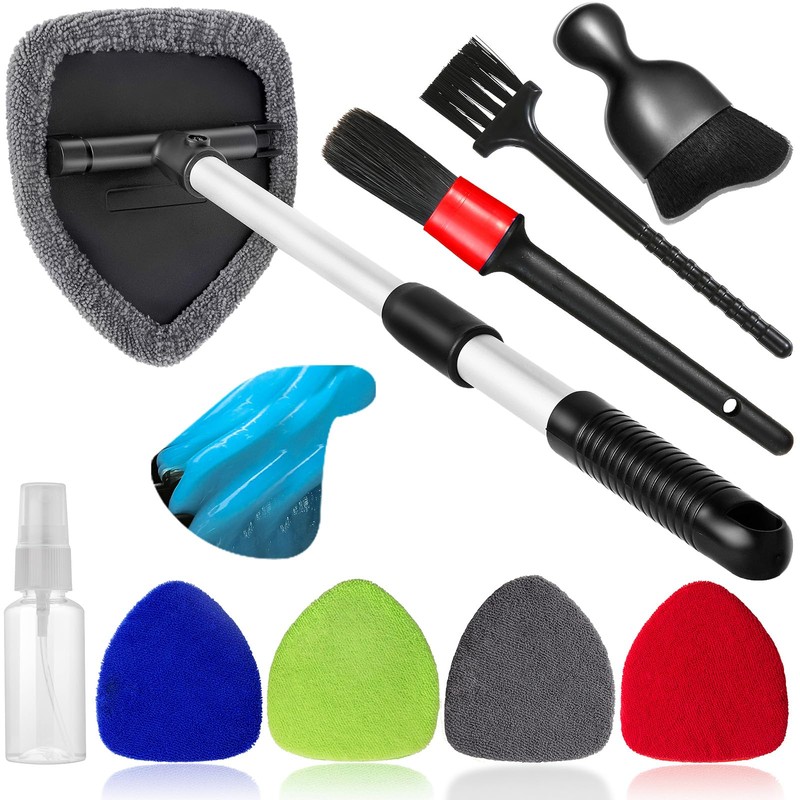 - This 10 pieces car windshield cleaner tool kit comes with 1 windshield cleaner tool, 1 spray bottle, 4 triangular microfiber pads that are reusable and washable, 1 interior detailing brush with soft bristle, 1detailing brush, 1 crevice brush, 1 cleaning gel