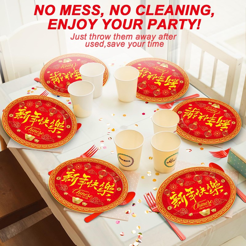 - High quality: These happy 2025 snake year tableware set are made of sturdy thick paper, no smell and heavy-duty, clear printed and with waterproof and oil-proof films, and can hold food of average weight. Disposable Chinese new year eve paper plates reduces clean-up time so you can enjoy more time with friends and family at your party.