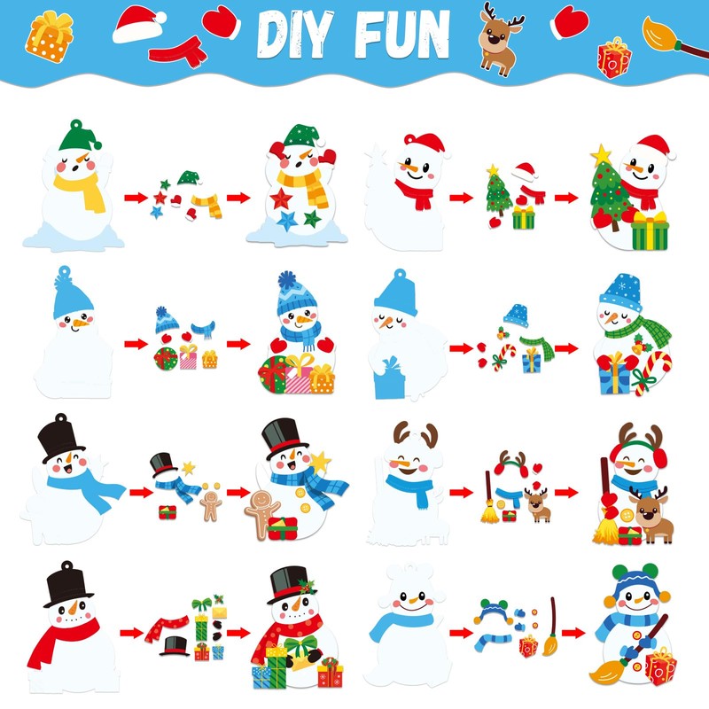- 【DIY Winter Craft Kit】: The package includes 48pcs printed Snowmen shape designs, 36pcs stickers in different patterns ( Mints, Snowmen, Santa hat, Elk, Christmas trees, gingerbread men, presents, scarf, woolen hat, top hat, broom, Santa hat, etc.)with enough ribbon, which can bring you a sense of winter; You can create unique all art and crafts by yourself, and develop your practical ability as you play.