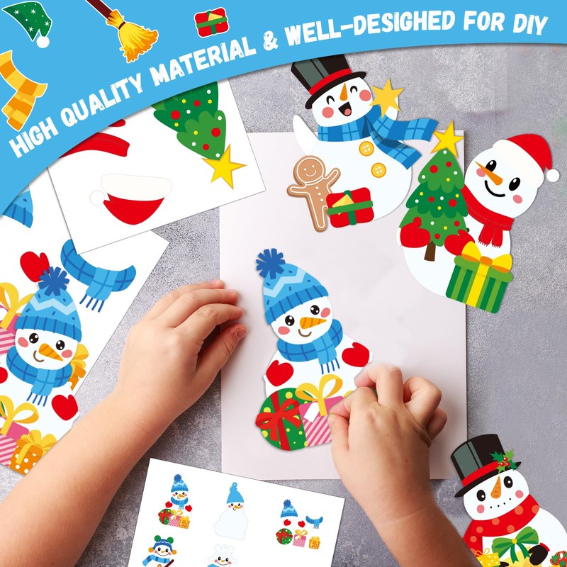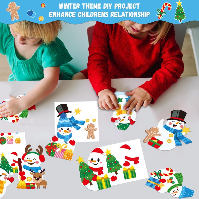 - 【Safe and Easy to Use】: Our winter craft set are made of environmentally friendly material, non-toxic and odorless. Steps to use: 1. Peel off the colorful stickers ; 2. Put the stickers on the Christmas snowmen winter craft.