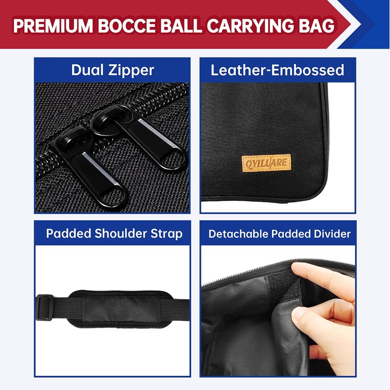 - Heavy-Duty Bocce Ball Case:Built with rugged 600D water-resistant outer fabric and reinforced stitching, ensuring long-lasting durability for outdoor play, travel, or storage. The brown leather handle adds a touch of elegance while staying sturdy