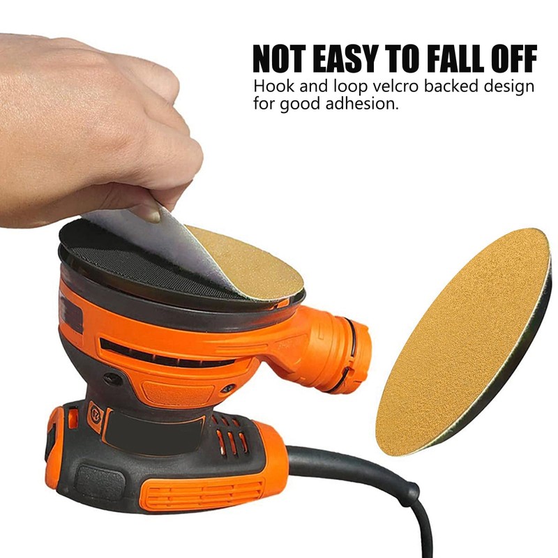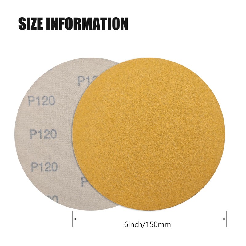 - Package Included: 50pcs of premium 120 grit 6” gold sanding discs with a hook & loop backing. High-performance enables them to be quickly and securely attached to a sanders hook & loop backing plate.