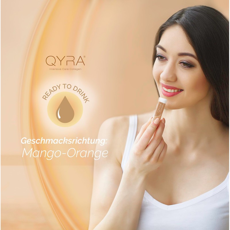 For naturally beautiful skin from the inside. With increasing age, the body's own collagen production decreases, the skin loses elasticity and wrinkles develop. QYRA can counteract the loss of body's own collagen from the inside out and has been proven to strengthen, tighten and firm the skin*. As a result, wrinkles smooth out from the inside. QYRA collagen drink contains Verisol, scientifically tested bioactive collagen peptides to stimulate the body's own collagen production. The vitamins biotin and niacin contribute to the maintenance of normal skin.