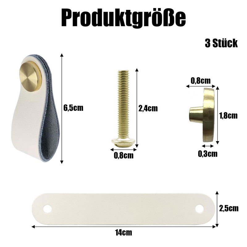 - Set of 3 leather handles: 3 leather handles and 3 screws. Length 6.5 cm, width 2.5 cm; metal head 18 mm; suitable for 18 mm thick panelsThis size fits perfectly for most knobs for cabinets, drawers and cabinet doors, providing a balance between functionality and aesthetics.