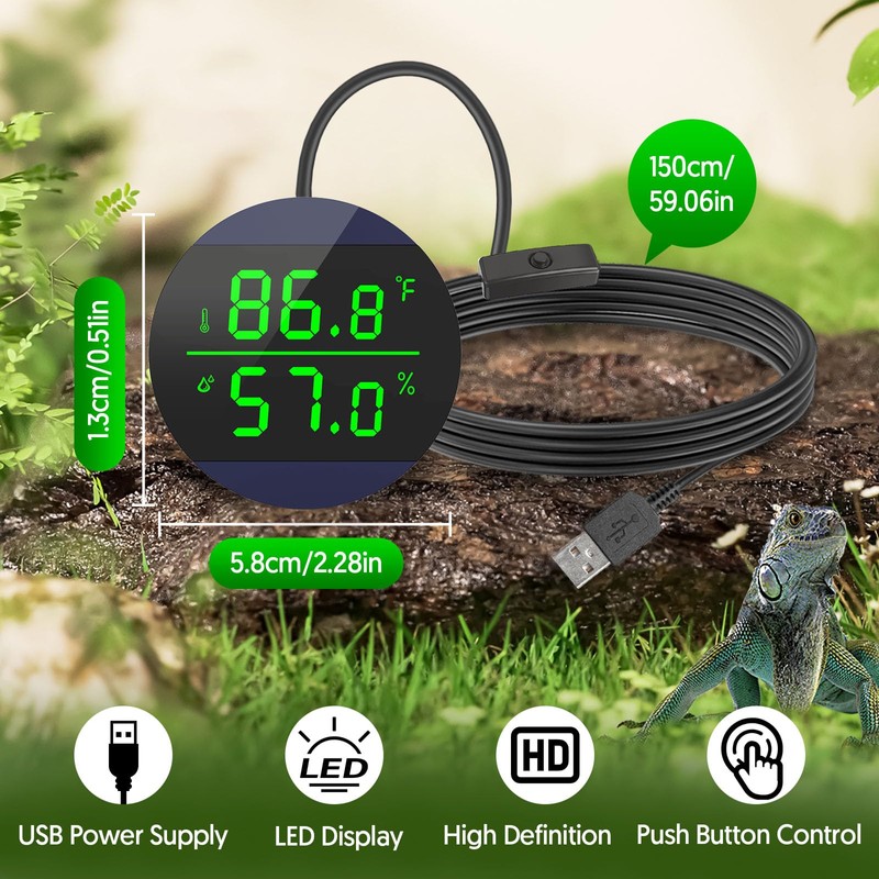- User-Friendly Design: Lightweight and compact, our hygrometer for reptile tank comes with double-sided tape for easy attachment inside your pet's enclosure. With a USB port and a power cable( 150 cm/59.06 in ), this reptile humidity gauge effectively allows for more extensive use, simply plug in and press the button to start monitoring your pets' environment effortlessly