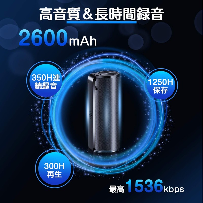 - (350 Hours Continuous Recording & 32 GB Large Capacity) Compact yet capable of recording for long periods of time. Equipped with a rechargeable 2600 mAh battery, it can record up to 350 hours of continuous recording time on a full charge. ▶ The battery can hold a long time, so you don't have to worry about the battery running out and stopping the recording. Designed for long meetings and challenges. ▶ Equipped with 32GB built-in memory, it can store up to 1250 hours of recording