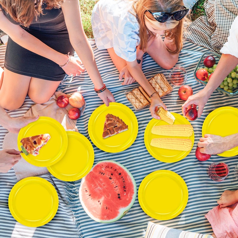 4. These 7-inch round plates in a striking yellow color are perfect for a wide range of party themes and occasions.