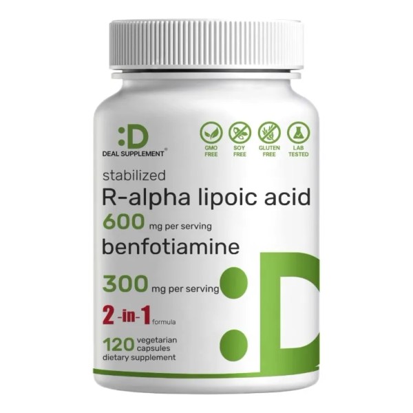 🧠 R-ALA + Benfotiamina – 120 cápsulas es una fórmula sinérgica diseñada para brindar apoyo neuroprotector, antioxidante y metabólico. Combinando Ácido Alfa Lipoico en su forma R (R-ALA), la más biodisponible y efectiva, con Benfotiamina, una forma avanzada de vitamina B1, este suplemento ayuda a proteger las células nerviosas, mejorar la salud mitocondrial y reducir el estrés oxidativo, especialmente en personas con diabetes, neuropatía o envejecimiento celular acelerado.